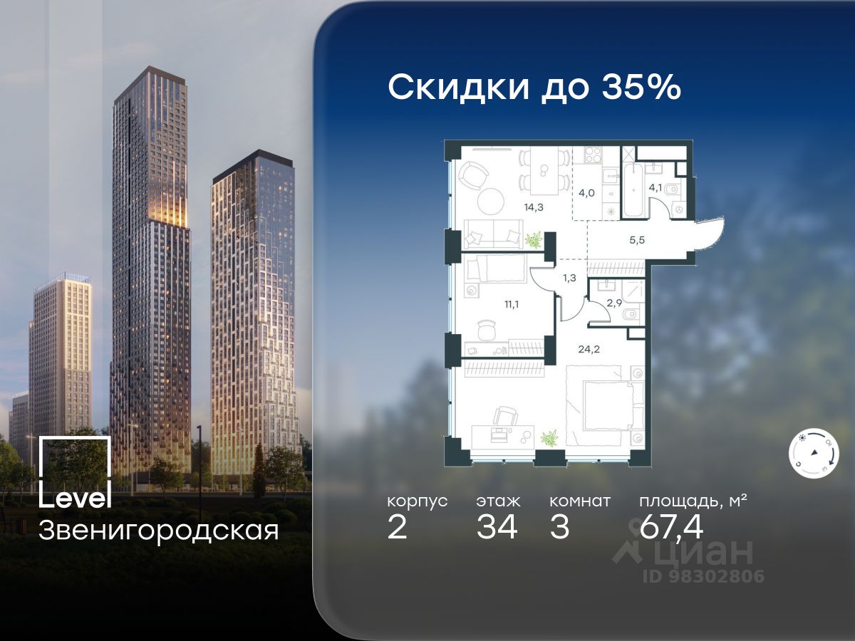 В жилом квартале продаётся 3-комнатная квартира площадью 67.40 кв.м без отделки. Квартира расположена на 34 этаже 64 этажного корпуса 2 в жилом комплексе комфорт класса Level Звенигородская (компания Level Group/Левел групп).