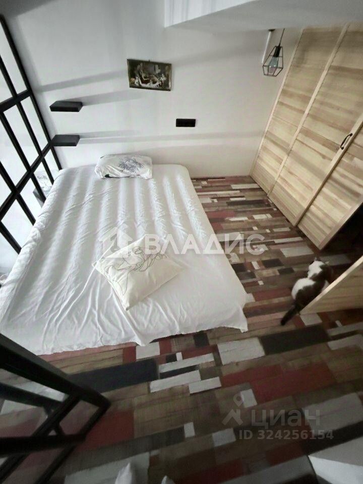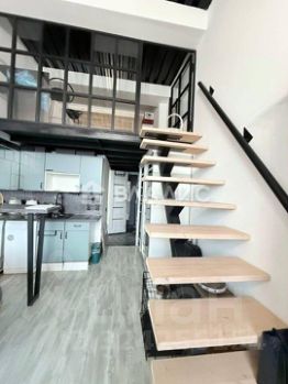 Эта студия с дизайнерским ремонтом, очень тёплая и уютная — отличное решение для молодых специалистов или студентов, а так же для молодой семьи. Высота потолков 4,1 м позволяет организовать пространство максимально комфортно, А спальня на втором этаже просторная и ИЗОЛИРОВАННАЯ, посмотрите сами на сколько там уютно, а так же второй этаж увеличен по полу под удобную гардеробную 3м в длину, поэтому студию можно считать полноценной евро двушкой с отдельной спальней на втором этаже!