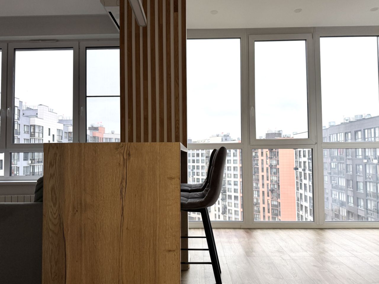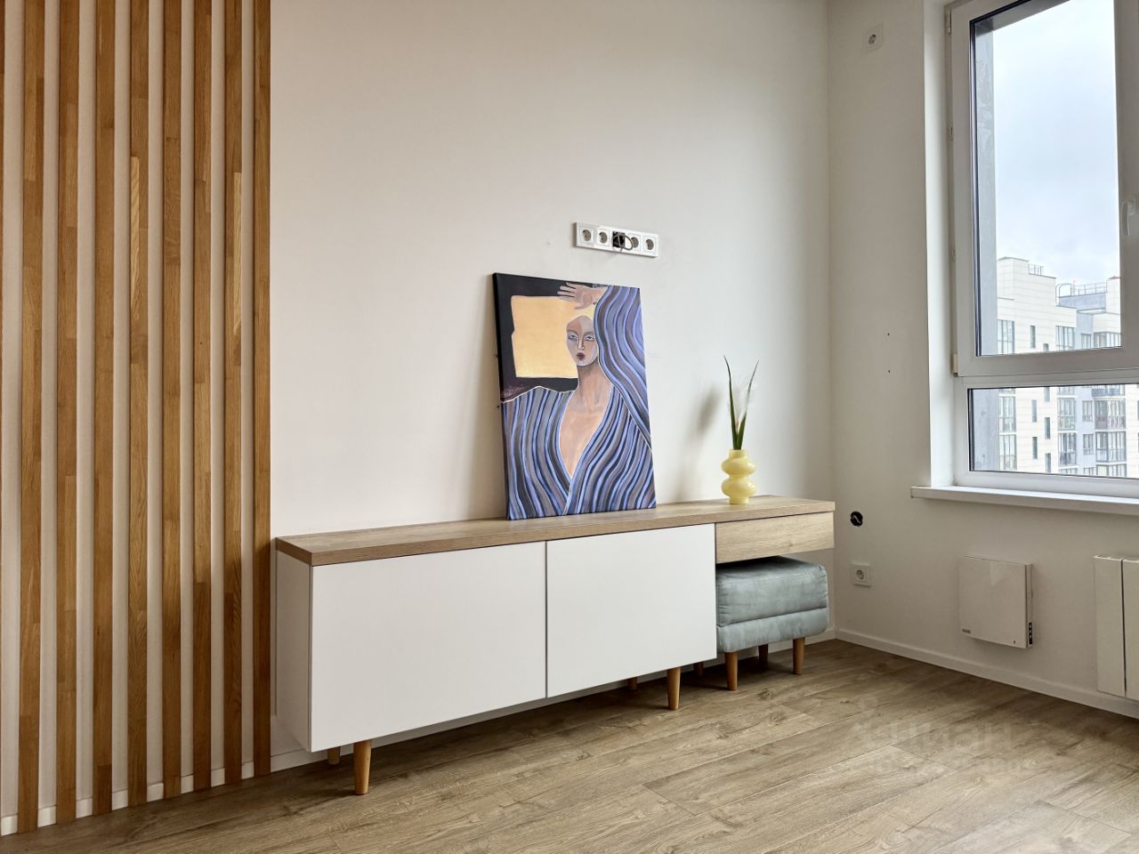 Продаётся стильная квартира с функциональной планировкой.Комната совмещена с кухней, есть гардеробная, санузел с душевой кабиной. Много мест хранения, окна в пол, вид в тихий благоустроенный двор.