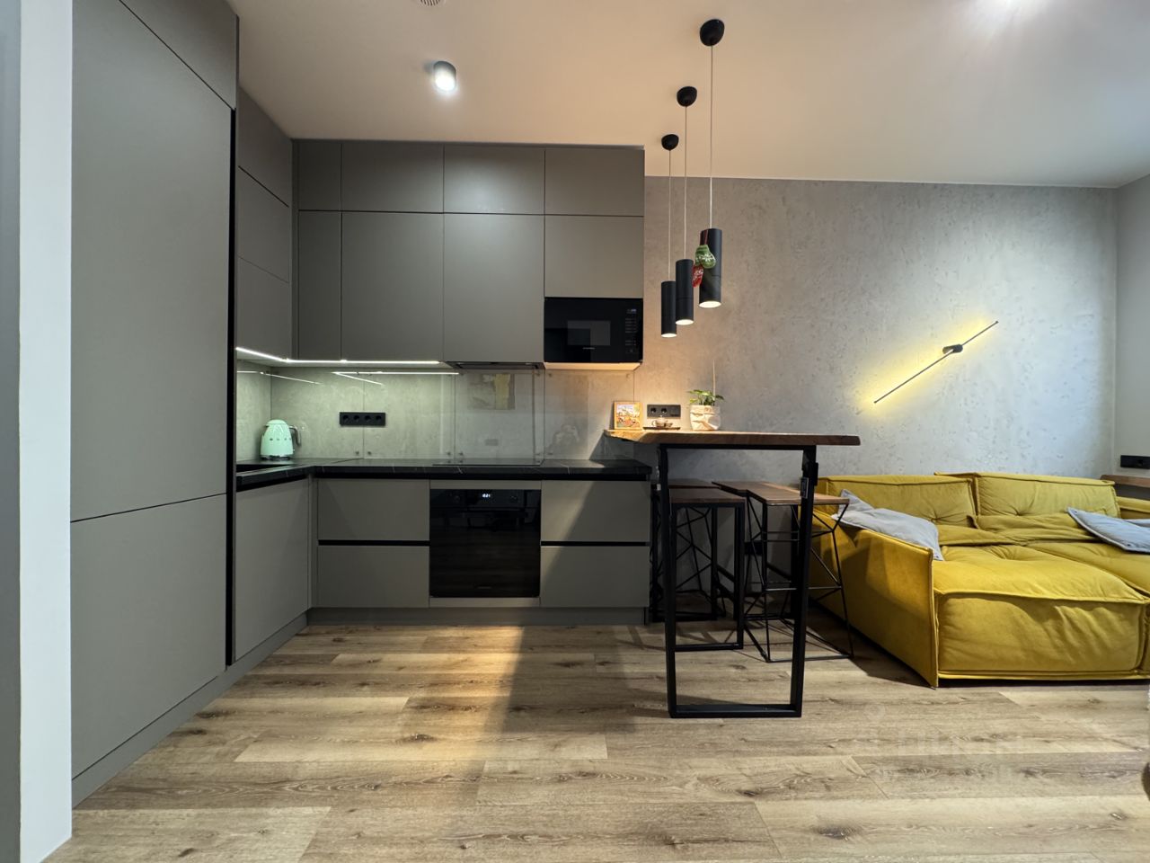 Функциональная планировка: Просторная кухня-гостиная с барной зоной и отдельная приватная спальня с вместительной системой хранения. При входе — гардеробная для обуви и верхней одежды. Продумано 15 сценариев освещения для разного настроения: расслабление, работа, приём гостей.