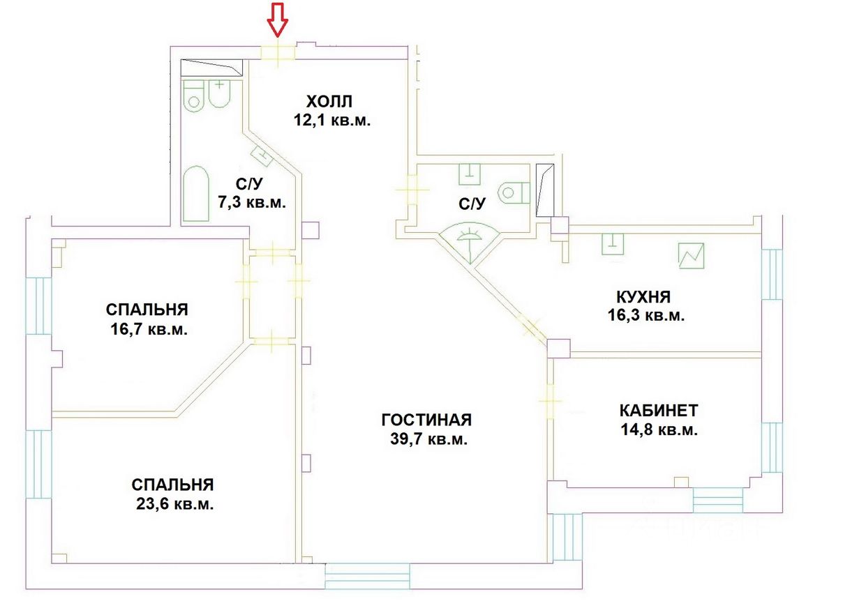 Большая четырехкомнатная квартира с огромной гостиной, кабинетом, кухней, двумя спальнями и двумя санузлами.