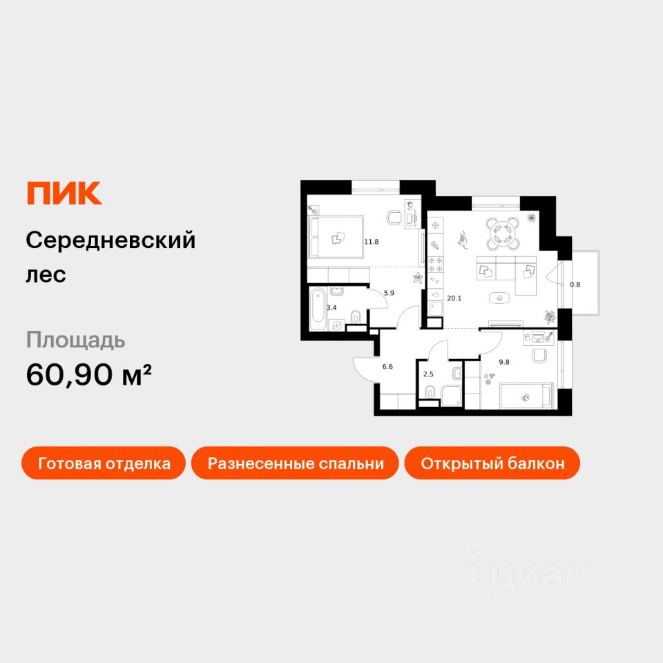 Продаётся 2-комн. квартира площадью 60,9 кв.м на 7 этаже 16 этажного дома (Корпус 2.1.2, Секция 2) проекта ПИК Середневский лес. Светлый просторный подъезд на уровне земли, функциональная планировка, большие окна, c отделкой.