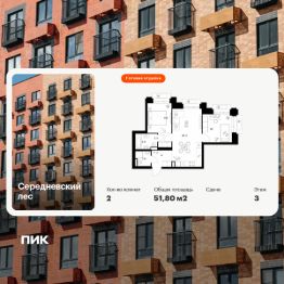 Продаётся 2-комн. квартира площадью 51,8 кв.м на 3 этаже 16 этажного дома (Корпус 2.1.5, Секция 5) проекта ПИК Середневский лес. Светлый просторный подъезд на уровне земли, функциональная планировка, большие окна, c отделкой.