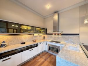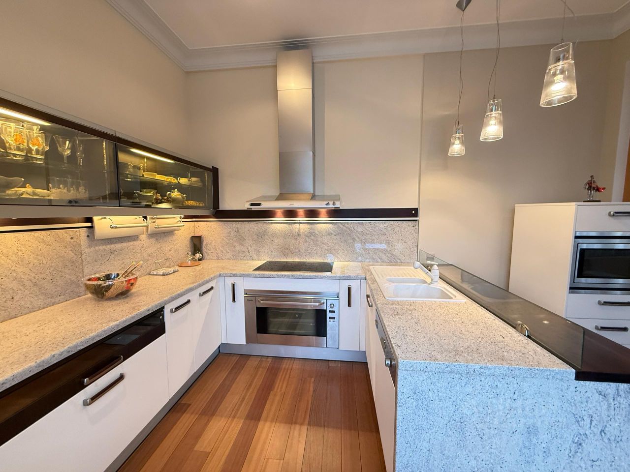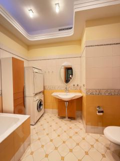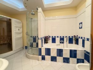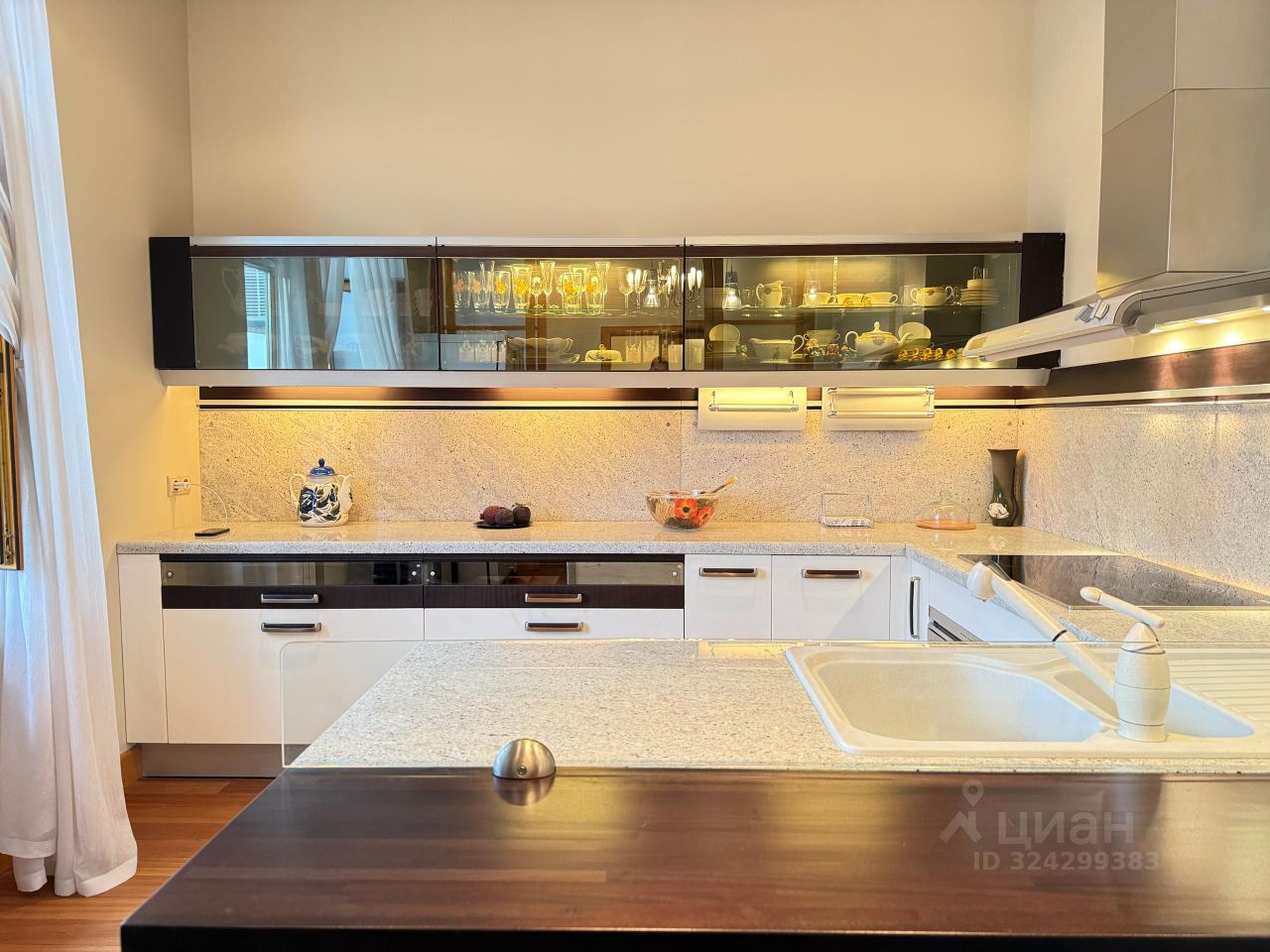 Ремонт выполнен с использованием дорогих натуральных материалов: камень, дерево, качественные напольные покрытия, премиальная сантехника и фурнитура, выверенный сценарный свет. В квартире установлена сауна, кухня-гостиная полностью укомплектована техникой и мебелью.