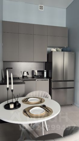 - обеденная зона и кухонный гарнитур с матовым фасадом, не оставляющим отпечатков, включающим раковину, варочную панель, микроволновку и большой двухдверный холодильник French door;