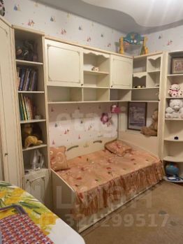 В детской мебель и отделка ориентированная на девочку. Кровать в окружении шкафов. Огромный встроенный шкаф.