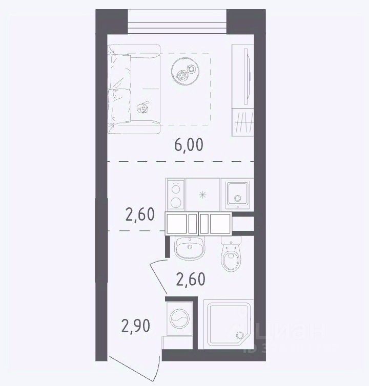 — кopпус 2.2 на 16 этaжe, площадь студии — 14,1 кв.м., cовмещенный санузeл — 2,6 кв.м.