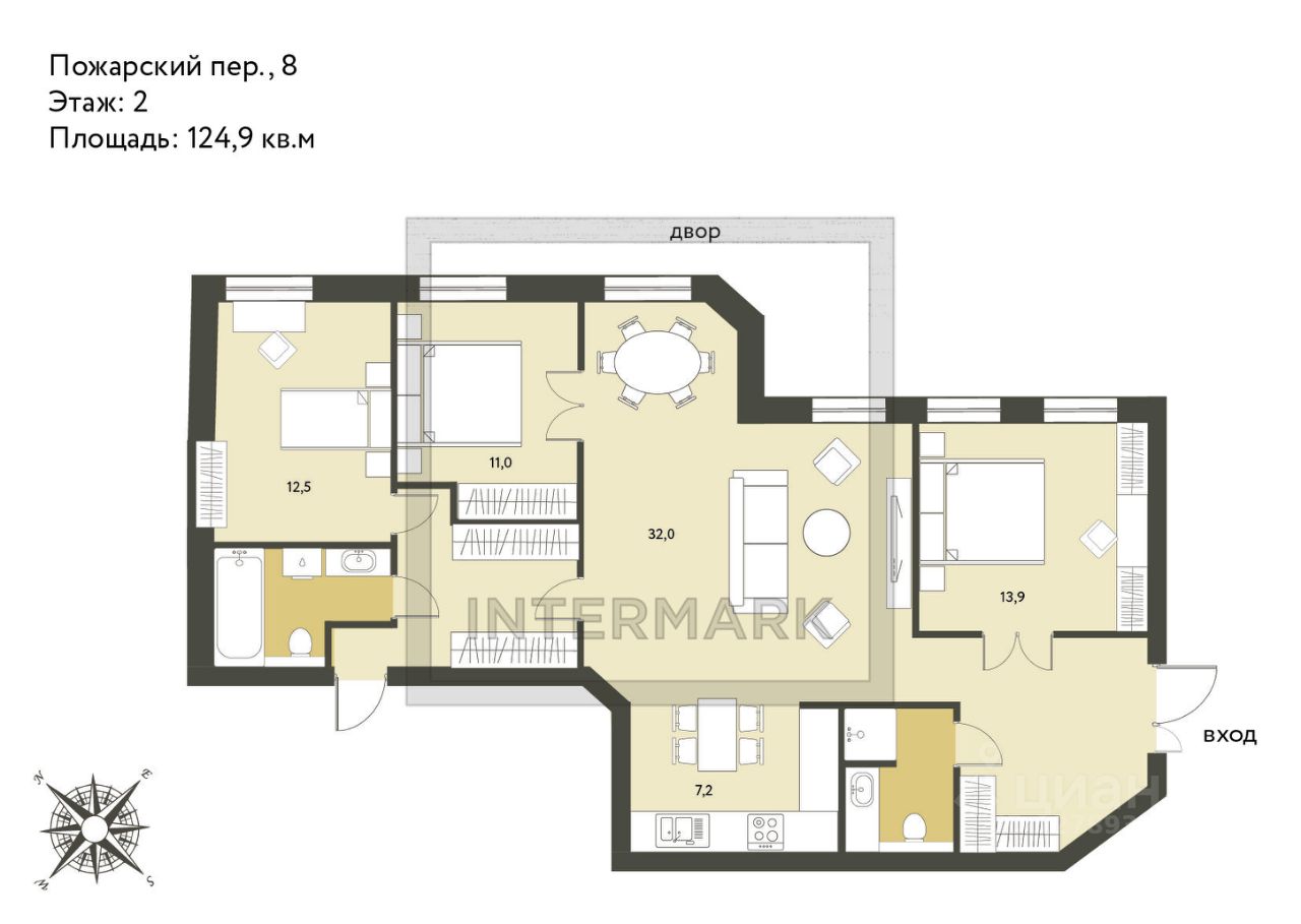 ID 65068. Эксклюзивно в компании INTERMARK. В известном доходном доме И. Герасимова в Пожарском переулке на Золотой миле предлагается 4-х комнатная квартира без отделки. Стены очищены до старинного красного кирпича, потолки 3,25 м. Спланированы зона кухни-гостиной, 3 отдельные спальни и 2 ванные комнаты. Есть готовый дизайн-проект. Окна квартиры выходят во двор.