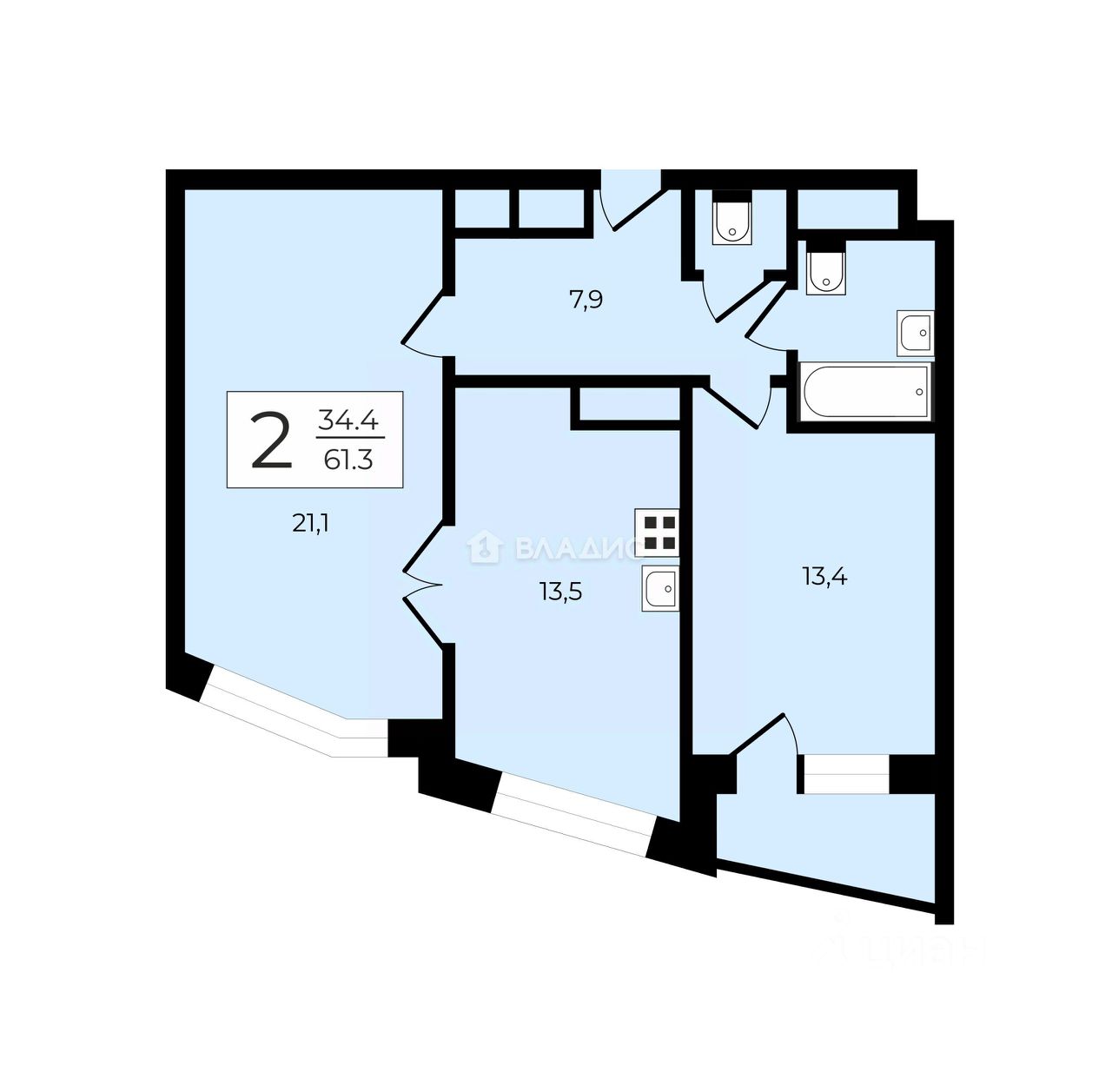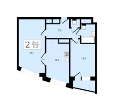 Общая площадь квартиры составляет 61,3 кв. м, из которых 34,5 кв. м — жилая площадь. Две изолированные комнаты с площадью 21,1 кв. м и 13,4 кв. м предлагают достаточно пространства для всех членов семьи. Высота потолков 2,7 м создаёт ощущение простора.