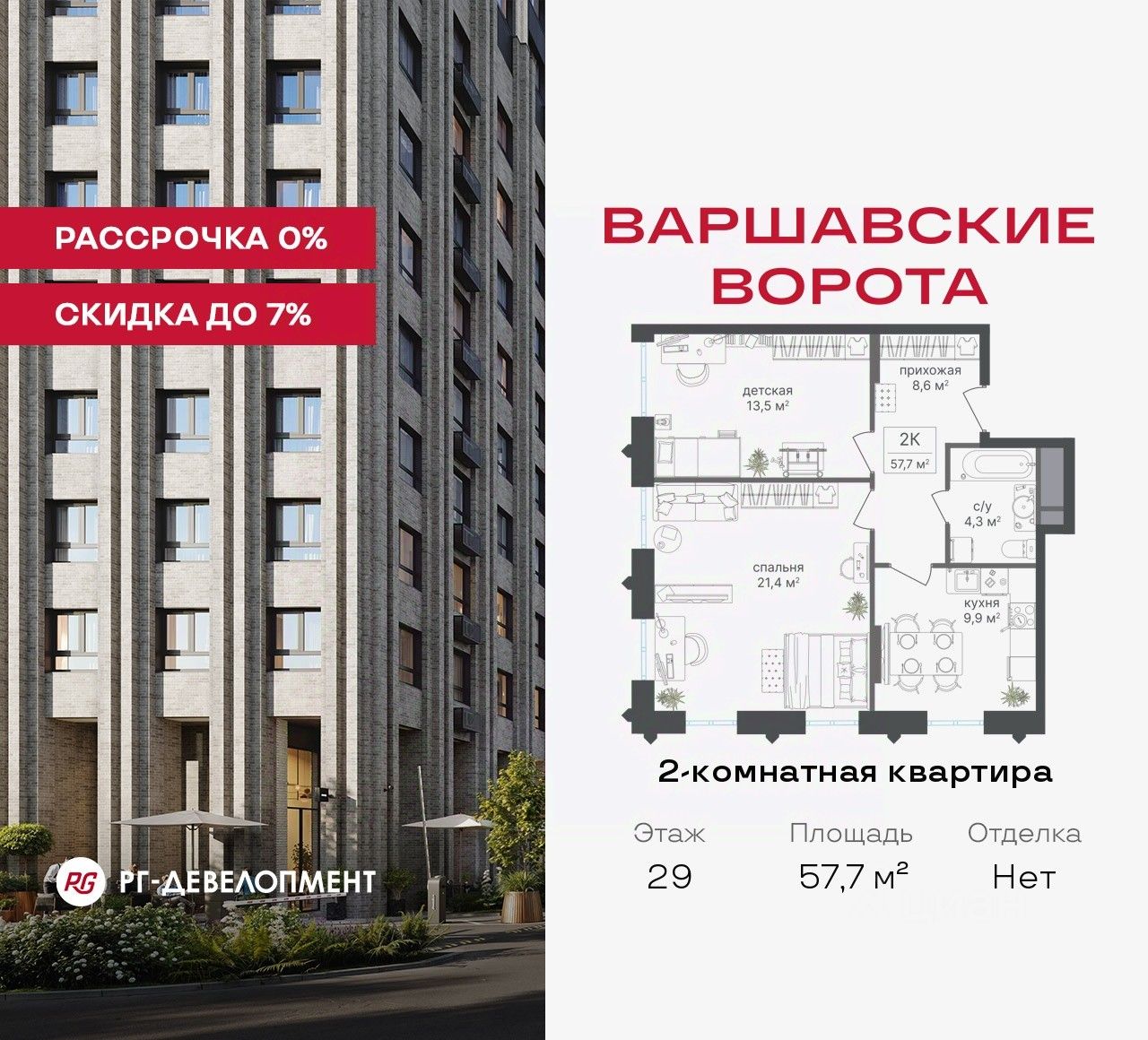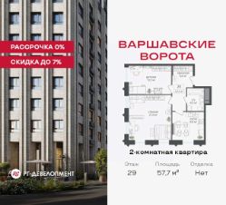 Продаётся 2-комнатная квартира 57,7 кв.м. в МФК "Варшавские ворота" на 29-м этаже 30 этажного дома. МФК "Варшавские ворота" — это точка баланса между природой и городом, стилем и функциональностью, жизнью сегодня и устойчивым будущим.