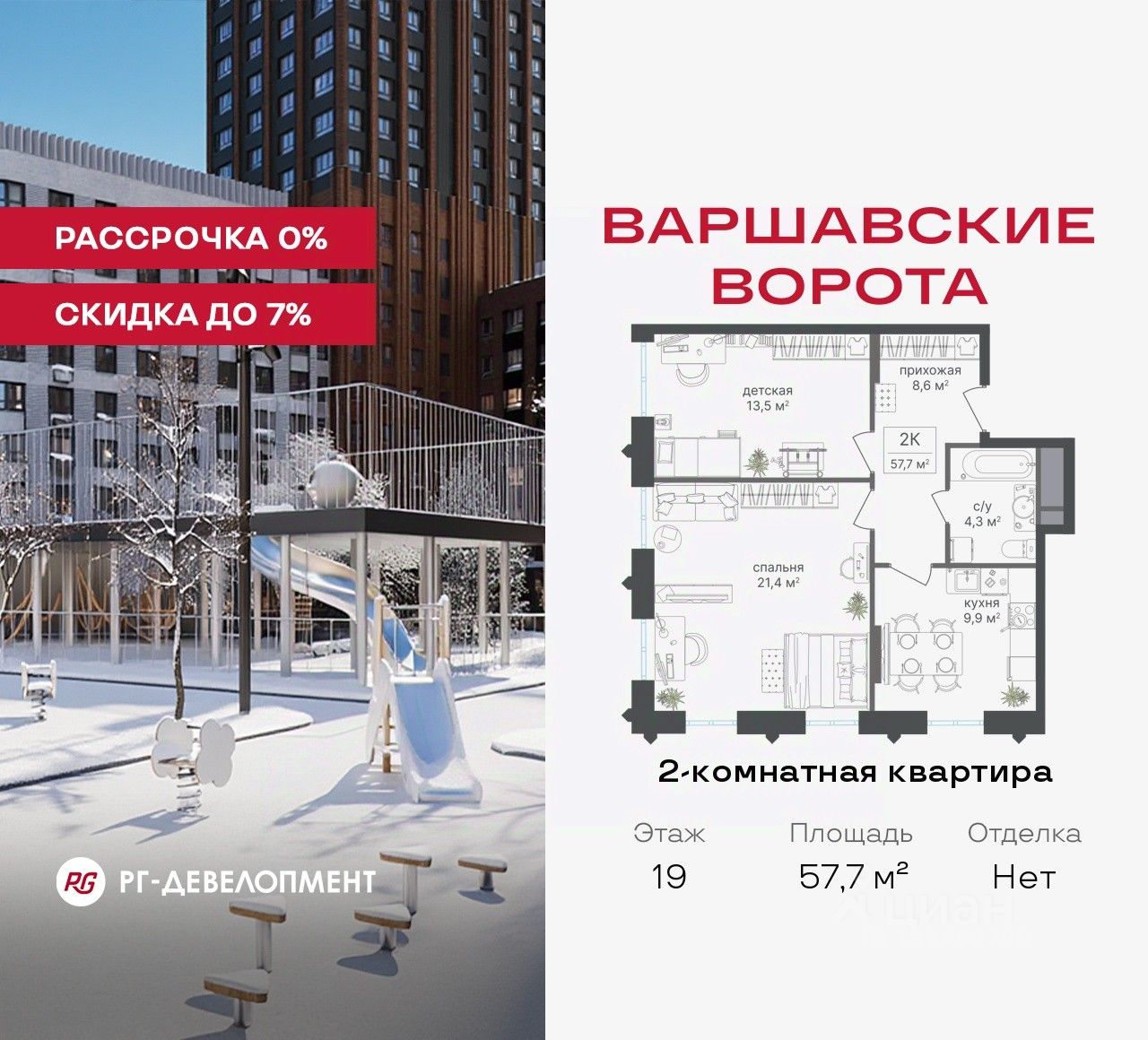 Продаётся 2-комнатная квартира 57.7 кв.м. в МФК "Варшавские ворота" на 19-м этаже 30 этажного дома. МФК "Варшавские ворота" — это точка баланса между природой и городом, стилем и функциональностью, жизнью сегодня и устойчивым будущим.