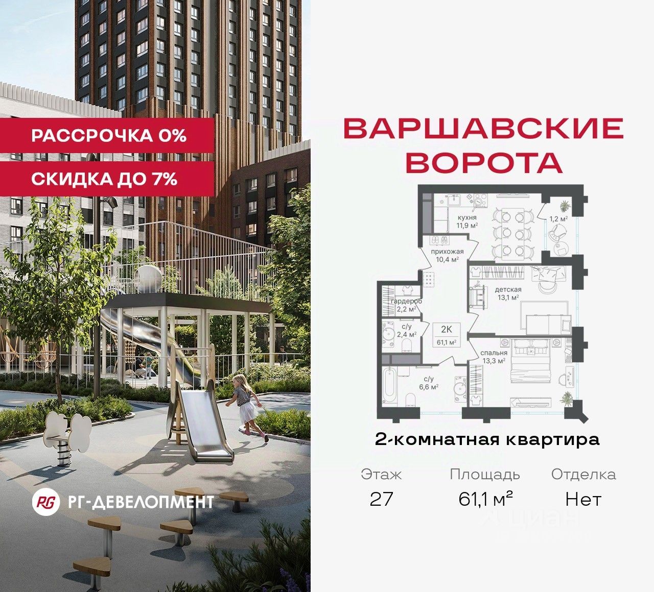 Продаётся 2-комнатная квартира 61,1 кв.м. в МФК "Варшавские ворота" на 27-м этаже 30 этажного дома. МФК "Варшавские ворота" — это точка баланса между природой и городом, стилем и функциональностью, жизнью сегодня и устойчивым будущим.