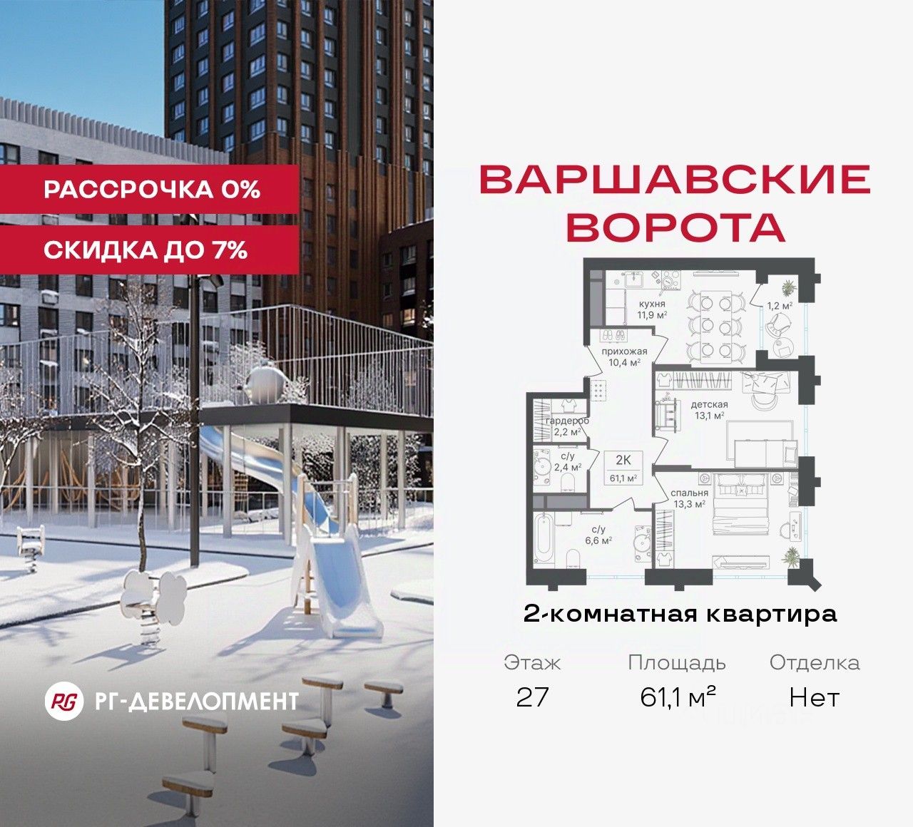 Рассрочка 0% + скидка 5%. Первый платёж 50% при ДДУ, второй 50% — через 12 мес. до ввода ЖК.