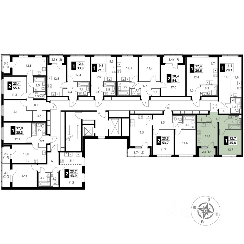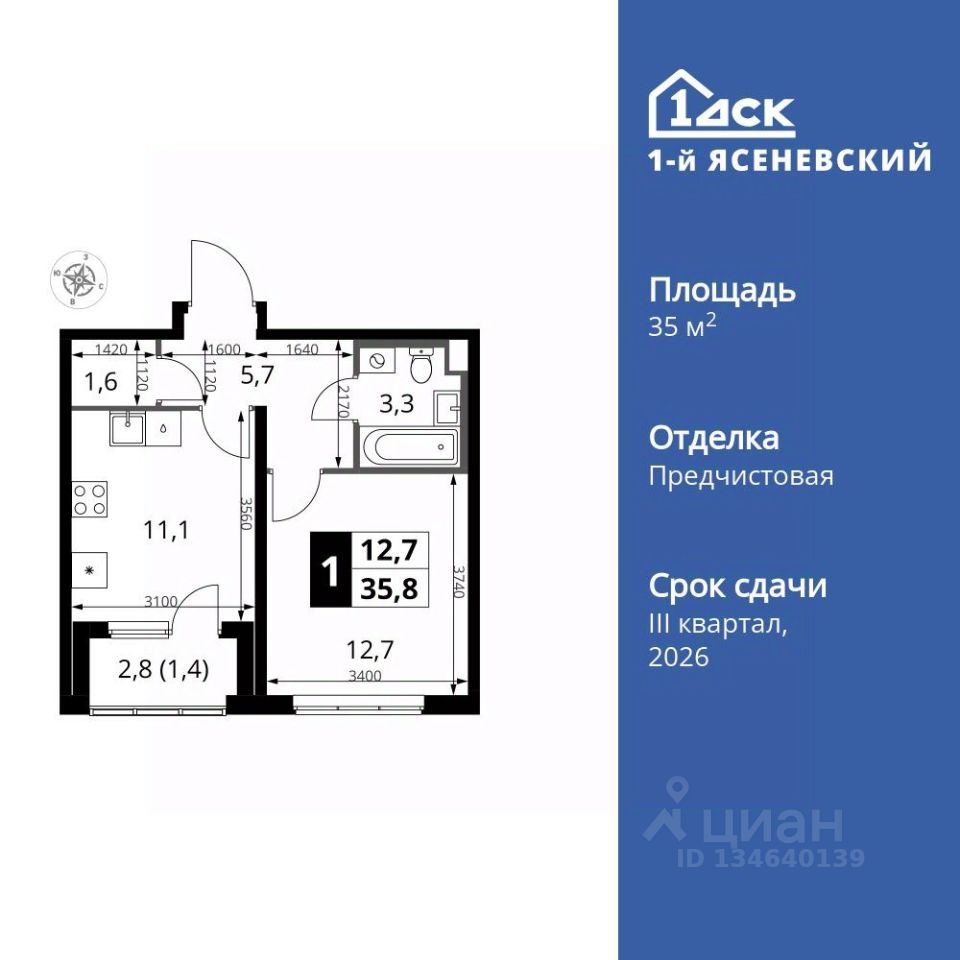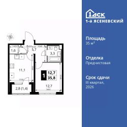 Продаётся 1-к квартира номер 9 общей площадью 35.8 кв.м. на 2-м этаже 16 этажного здания. Отделка Whitebox.