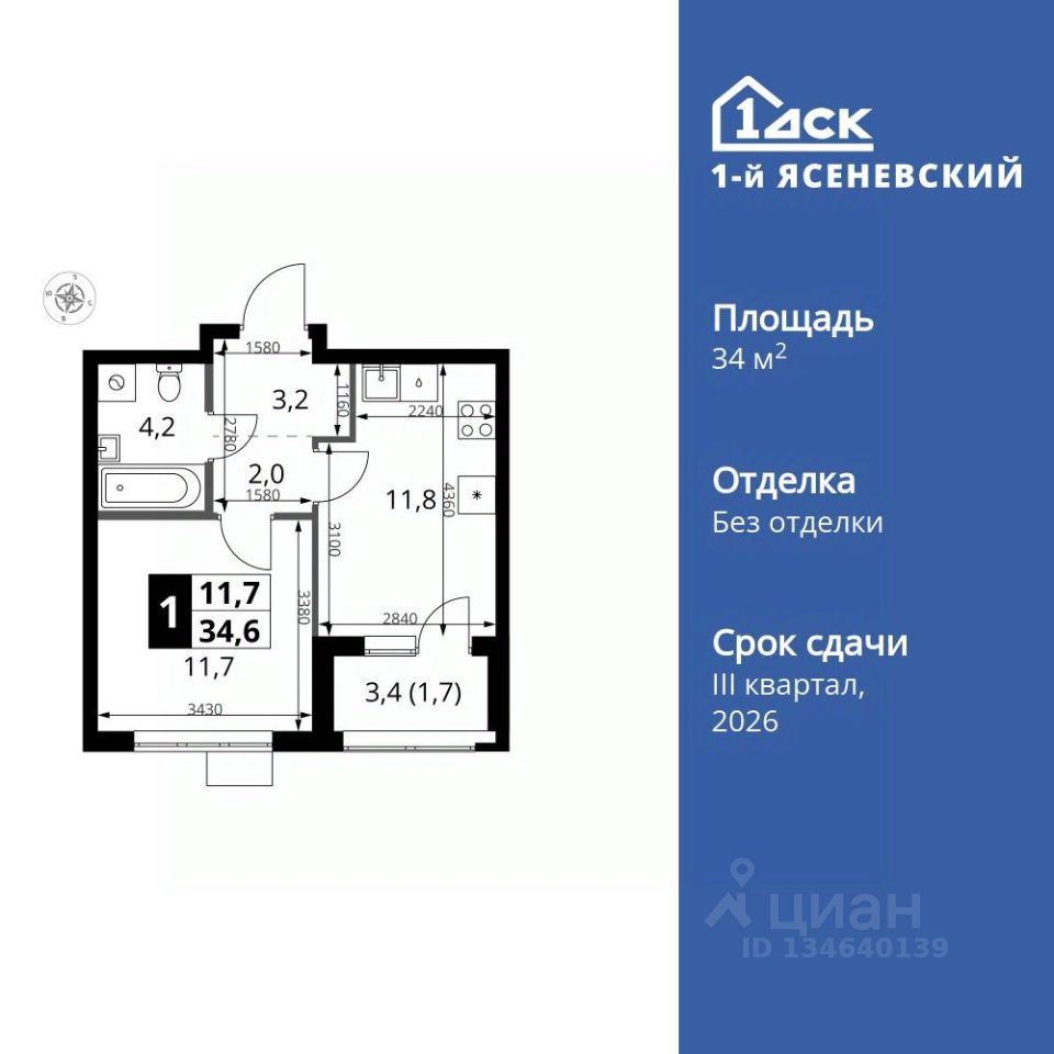 Продаётся 1-к квартира номер 330 общей площадью 34.6 кв.м. на 6-м этаже 18 этажного здания. Без отделки.
