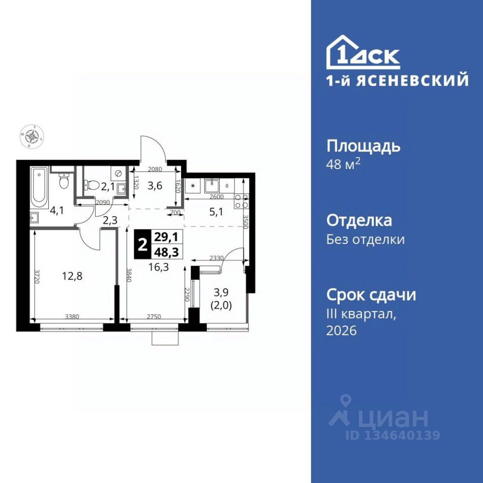 Продаётся 2-к квартира номер 861 общей площадью 48.3 кв.м. на 15-м этаже 16 этажного здания. Без отделки.