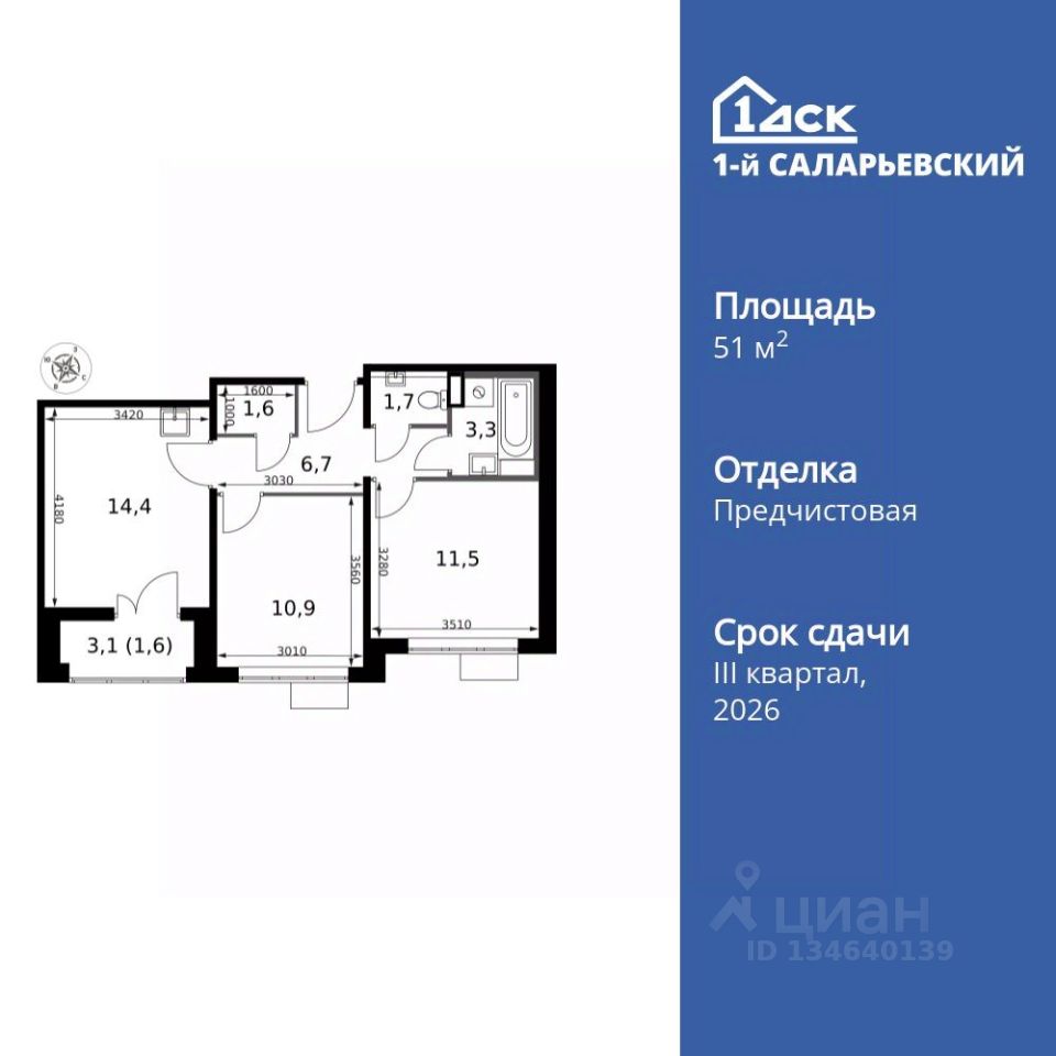 Продаётся 2-к квартира номер 480 общей площадью 51.7 кв.м. на 14-м этаже 24 этажного здания. Отделка Whitebox. Цена с учётом скидки.