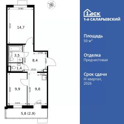 Продаётся 2-к квартира номер 462 общей площадью 50.6 кв.м. на 11-м этаже 24 этажного здания. Отделка Whitebox. Цена с учётом скидки.