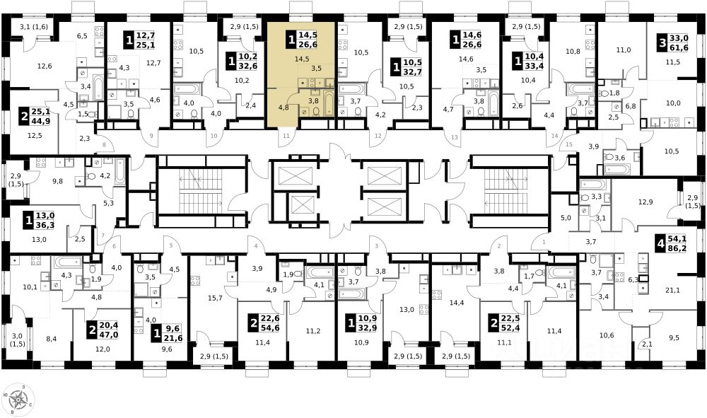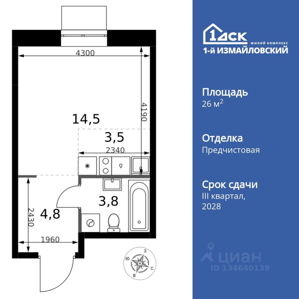 Продаётся квартира-студия номер 565 общей площадью 26.6 кв.м. на 11-м этаже 32 этажного здания. Отделка Whitebox.