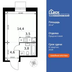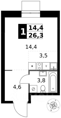 Продаётся квартира-студия номер 537 общей площадью 26.3 кв.м. на 9-м этаже 32 этажного здания. Отделка Whitebox.