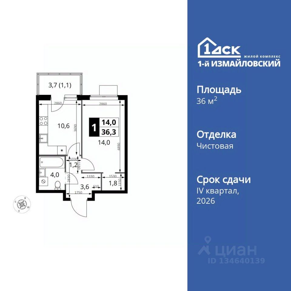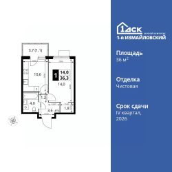 Продаётся 1-к квартира номер 281 общей площадью 36.3 кв.м. на 25-м этаже 25 этажного здания. Чистовая отделка. Цена с учётом скидки.
