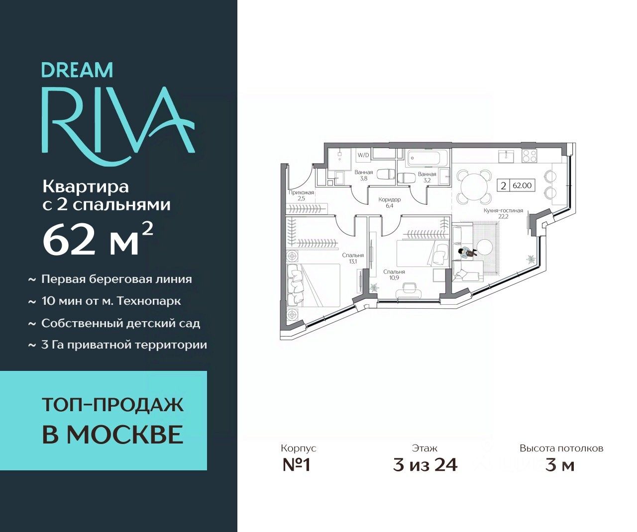 Продаётся Квартира с 2 спальнями квартира на 3 этаже 24-этажного дома (1 корпус).