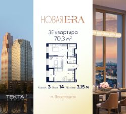 3-комн. квартира в ЖК "Era" на 14 этаже в 33 этажном здании Корпус 3. Общая площадь: 70.3 кв.м., жилая: 43.40 кв.м. Высота потолков 3.15 м.