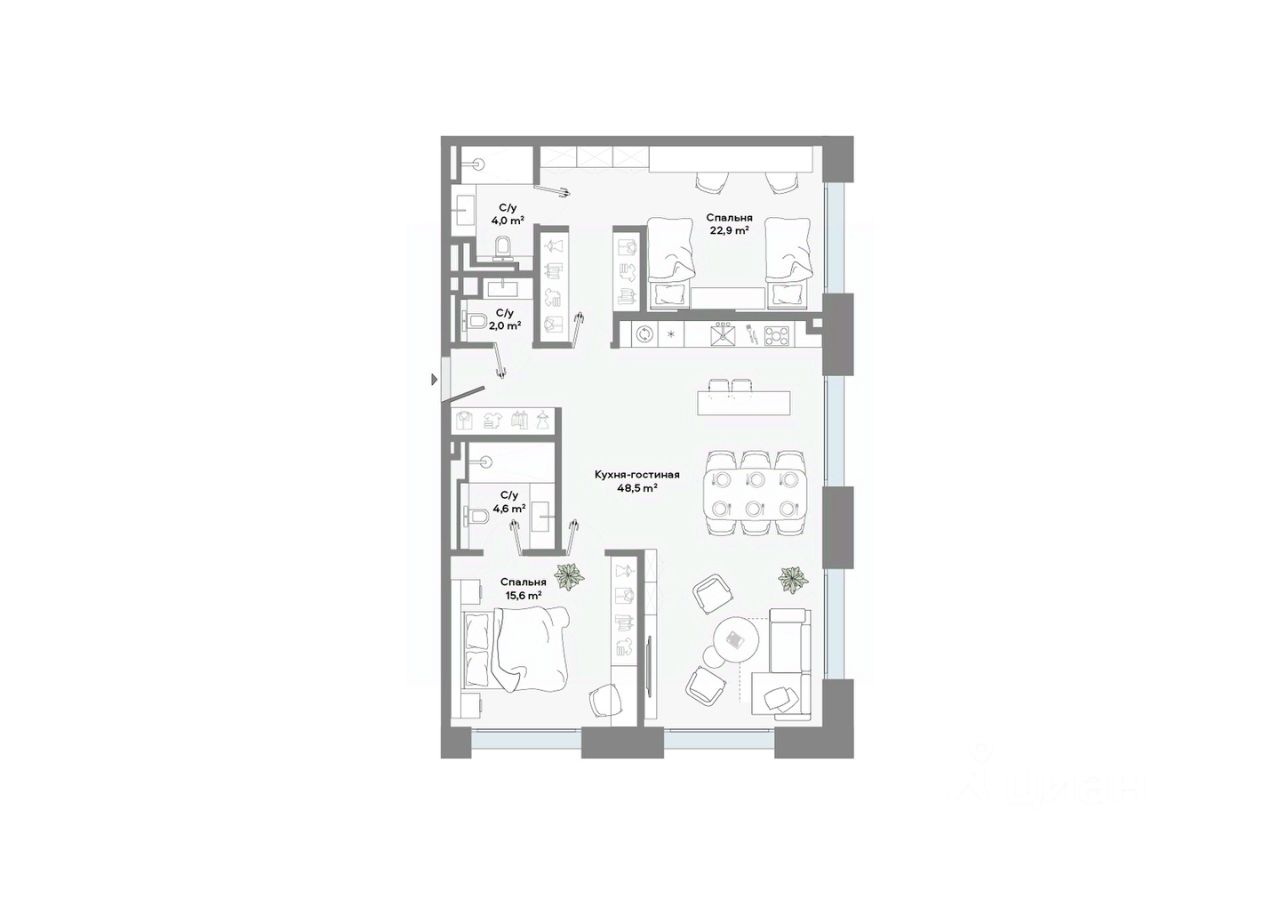 Продается 2-комнатная квартира площадью 97,6 кв.м. на 3-м этаже 9-этажного Клубного дома CULT. Высота потолков 3,2 м.