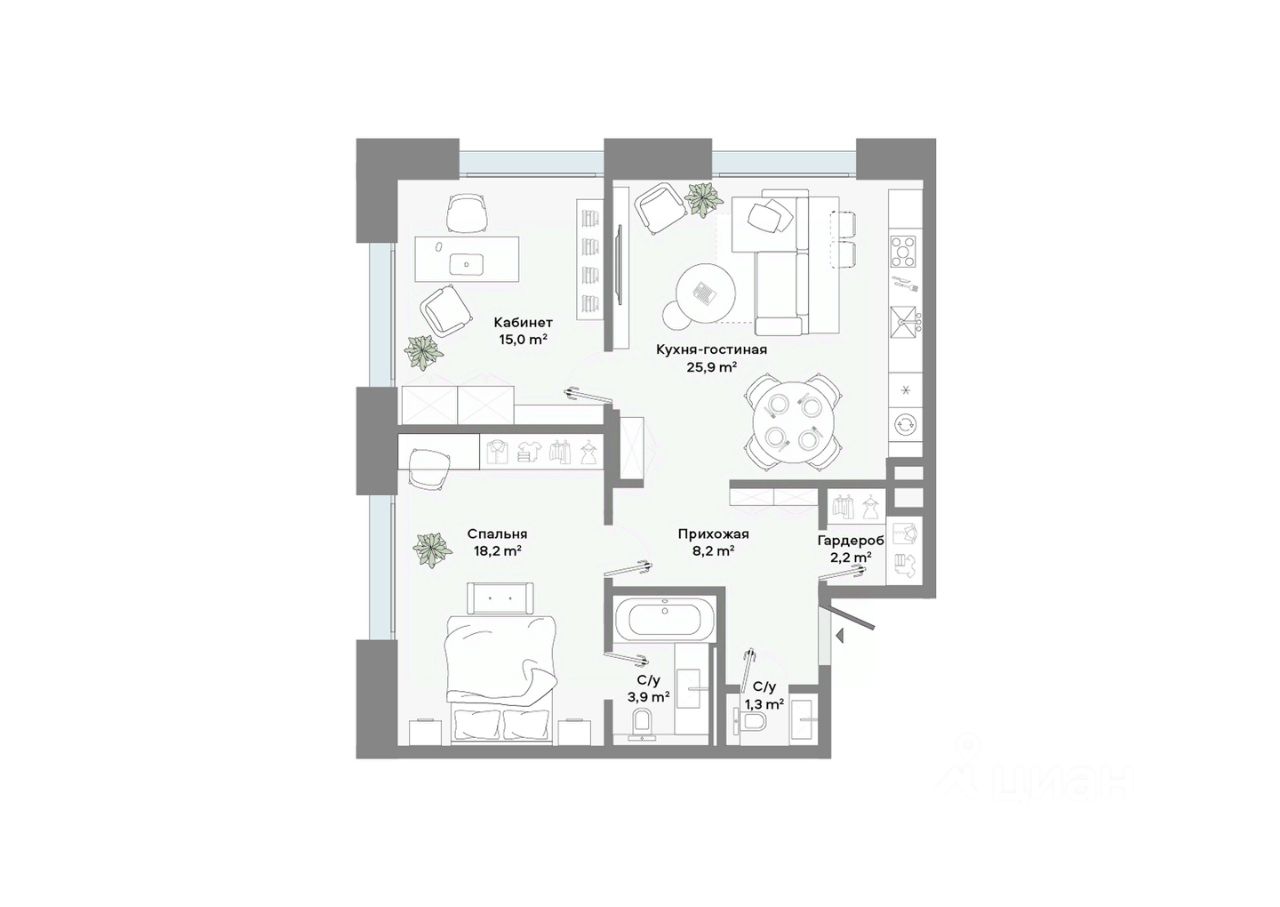 Продается 2-комнатная квартира площадью 74,7 кв.м. на 4-м этаже 9-этажного Клубного дома CULT. Высота потолков 3,2 м.