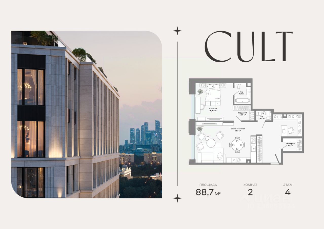 Продается 2-комнатная квартира площадью 88,7 кв.м. на 4-м этаже 9-этажного Клубного дома CULT. Высота потолков 3,2 м.