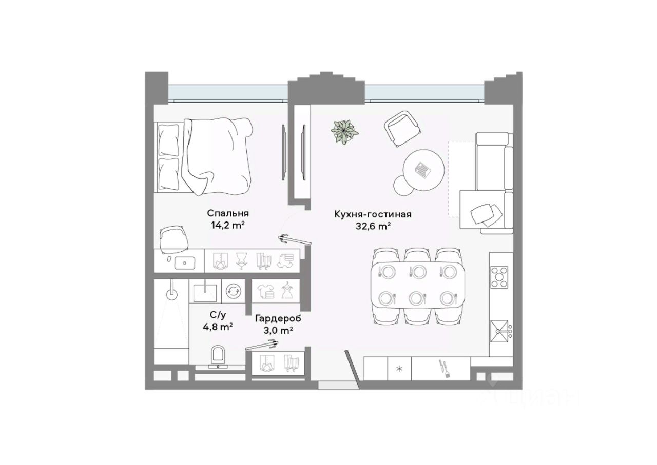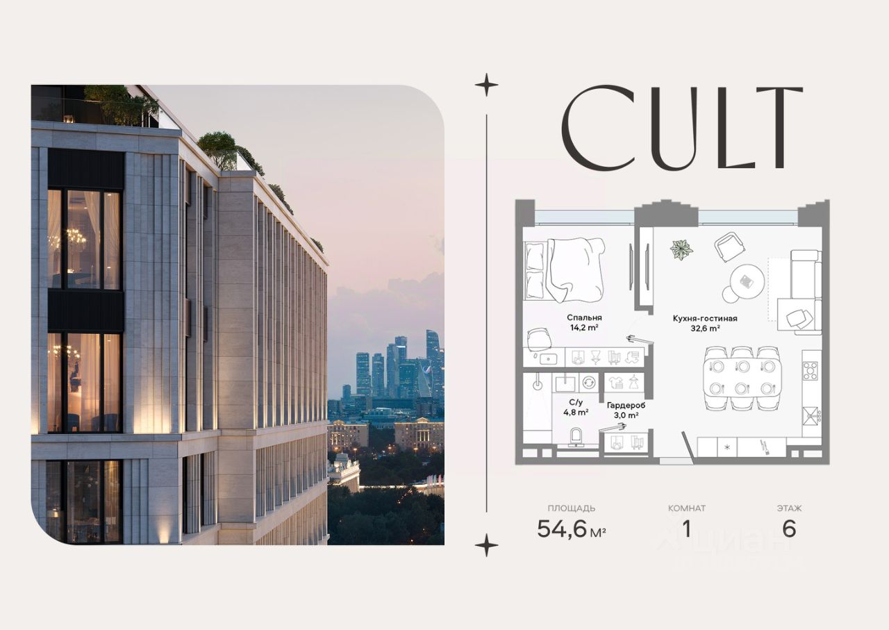 Продается 1-комнатная квартира площадью 54,6 кв.м. на 6-м этаже 9-этажного Клубного дома CULT. Высота потолков 3,2 м.