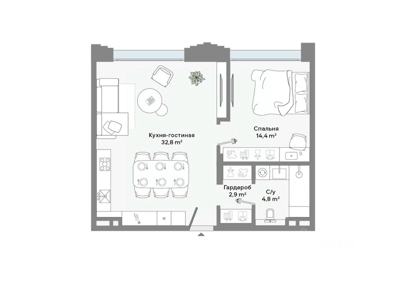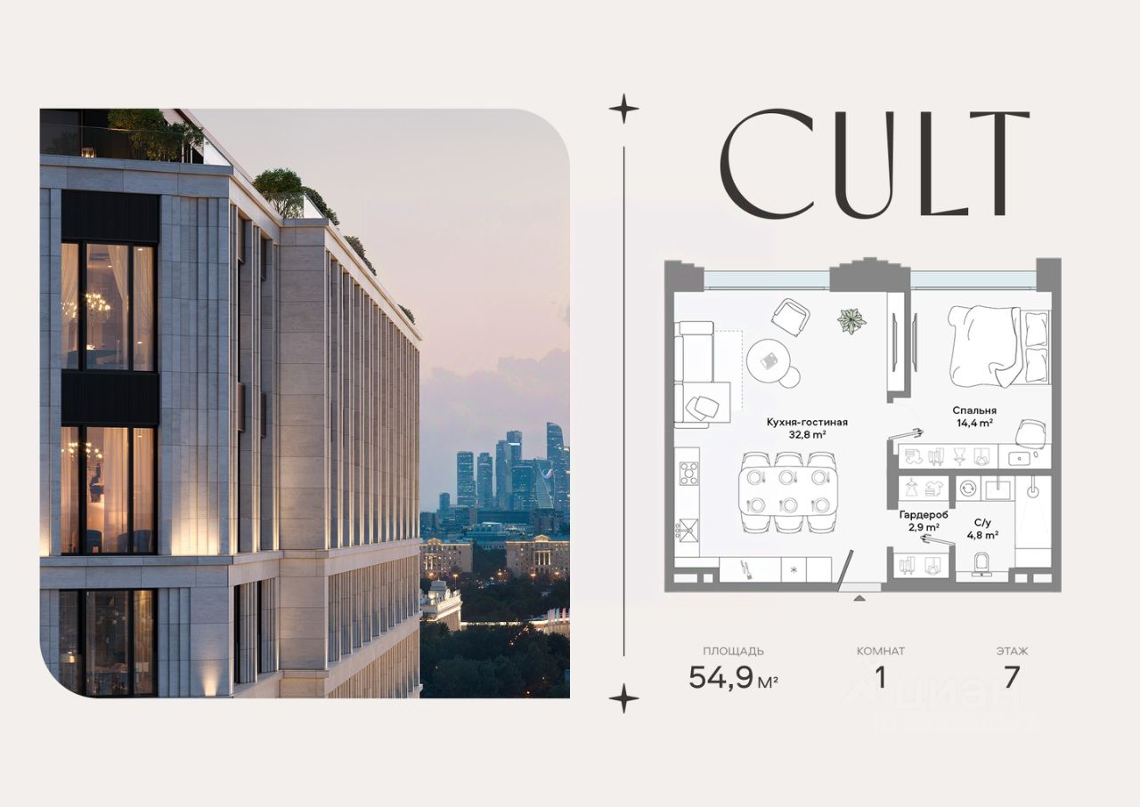 Продается 1-комнатная квартира площадью 54,9 кв.м. на 7-м этаже 9-этажного Клубного дома CULT. Высота потолков 3,2 м.