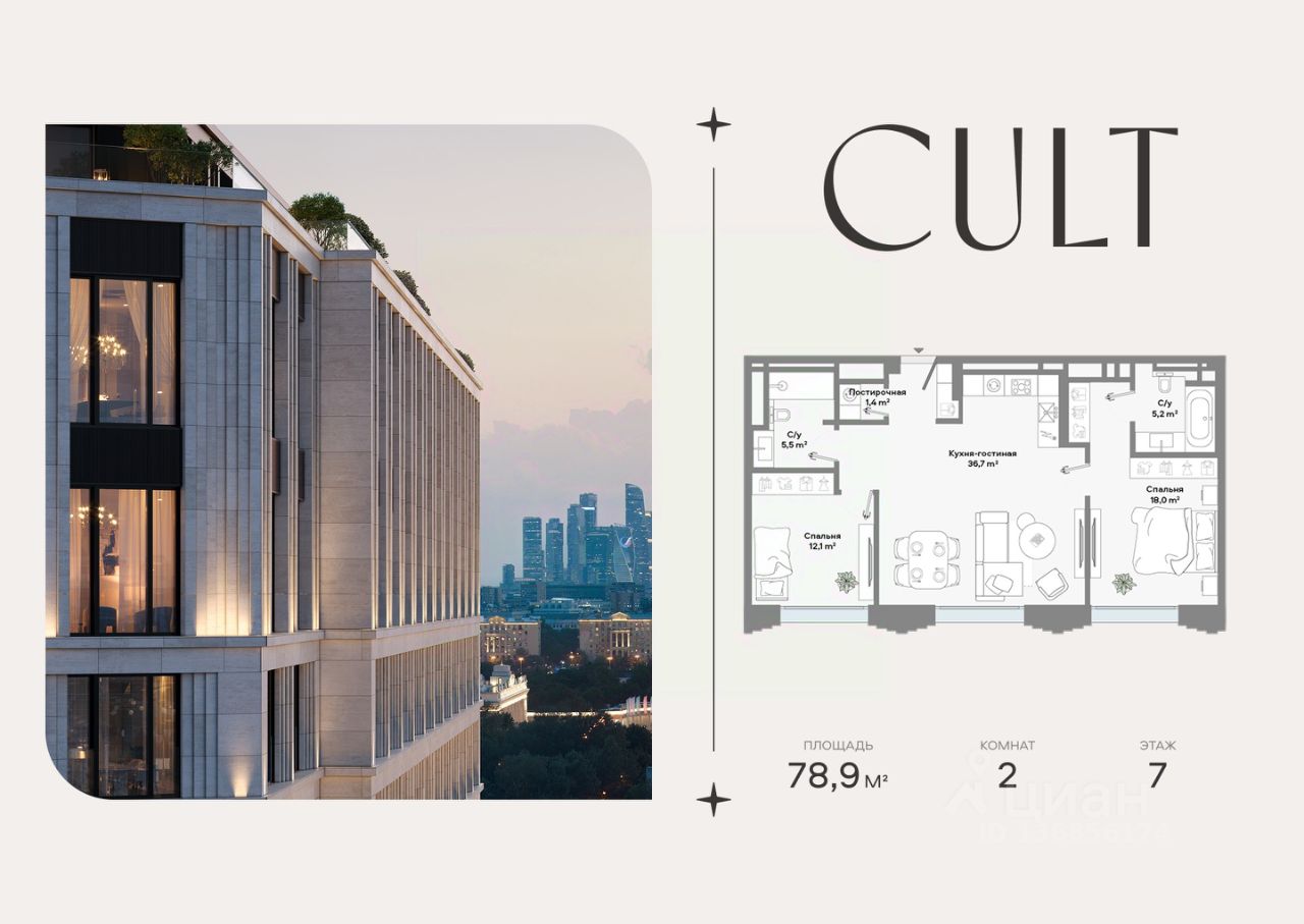 Продается 2-комнатная квартира площадью 78,9 кв.м. на 7-м этаже 9-этажного Клубного дома CULT. Высота потолков 3,2 м.