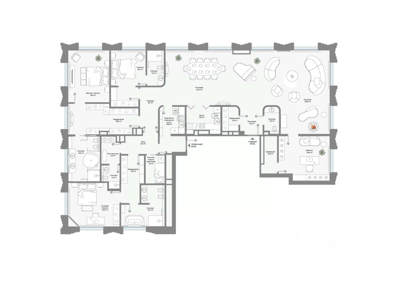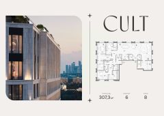 Продается 6-комнатная квартира площадью 307,3 кв.м. на 8-м этаже 9-этажного Клубного дома CULT. Высота потолков 4,5 м.