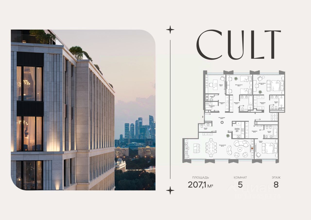 Продается 5-комнатная квартира площадью 207,1 кв.м. на 8-м этаже 9-этажного Клубного дома CULT. Высота потолков 4,5 м.
