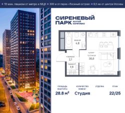 Продаётся просторная студия общей площадью 28.8 м² на 22 этаже в новом жилом комплексе "Сиреневый парк", расположенном в Восточном административном округе Москвы на улице Тагильская. Всего 10 минут ходьбы от станции метро "Бульвар Рокоссовского" и одноимённой платформы МЦК.
