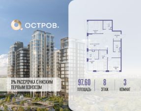 Продаётся 3-комн. квартира от застройщика: общая площадь 97.60 м², жилая 37.60 м², кухня 32.10 м², 8-й этаж, жилой квартал "Остров 12", корпус 4 (секция 1). Срок сдачи: 1 квартал 2029 года.