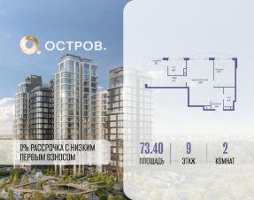 Продаётся 2-комн. квартира от застройщика: общая площадь 73.40 м², жилая 26.00 м², кухня 26.90 м², 9-й этаж, жилой квартал "Остров 12", корпус 4 (секция 1). Срок сдачи: 1 квартал 2029 года.