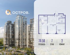 Продаётся 2-комн. квартира от застройщика: общая площадь 70.50 м², жилая 29.50 м², кухня 23.80 м², 7-й этаж, жилой квартал "Остров 12", корпус 4 (секция 1). Срок сдачи: 1 квартал 2029 года.