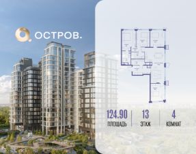 Продаётся 4-комн. квартира от застройщика: общая площадь 124.90 м², жилая 60.50 м², кухня 34.60 м², 13-й этаж, жилой квартал "Остров 12", корпус 2 (секция 1). Срок сдачи: 1 квартал 2029 года.