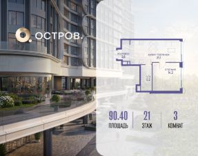 Продаётся трехкомнатная квартира от застройщика: общая площадь 90.40 м², жилая 43.60 м², кухня 29.60 м², 21, жилой квартал "Остров 7", корпус 7 (7 квартал) (секция 1). срок сдачи: 4-кв. 2025.