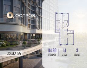 Продаётся трехкомнатная квартира от застройщика: общая площадь 114.90 м², жилая 55.80 м², кухня 19.00 м², 14, жилой квартал "Остров 7", корпус 2 (7 квартал) (секция 1). срок сдачи: 4-кв. 2025.