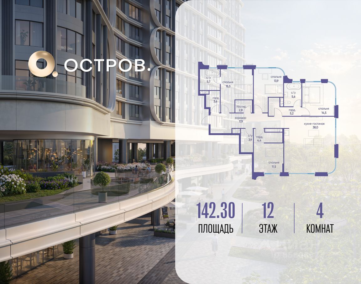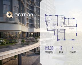 Продаётся четырехкомнатная квартира от застройщика: общая площадь 142.30 м², жилая 55.20 м², кухня 38.00 м², 12, жилой квартал "Остров 7", корпус 2 (7 квартал) (секция 1). срок сдачи: 4-кв. 2025.