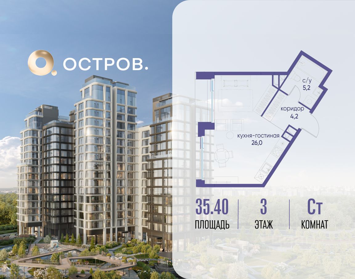 Продаётся студия от застройщика: общая площадь 35.40 м², жилая 20.00 м², кухня 6.00 м², 3, жилой квартал "Остров 12", корпус 1 (12.1 квартал) (секция 1). срок сдачи: 4-кв. 2025.