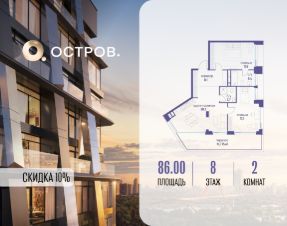 Продаётся двухкомнатная квартира от застройщика: общая площадь 86.00 м², жилая 34.90 м², кухня 28.30 м², 8, жилой квартал "Остров 12", корпус 1 (12.1 квартал) (секция 1). срок сдачи: 4-кв. 2025.