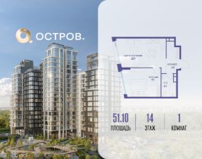 Продаётся однокомнатная квартира от застройщика: общая площадь 51.10 м², жилая 17.10 м², кухня 22.90 м², 14, жилой квартал "Остров 12", корпус 1 (12.1 квартал) (секция 2). срок сдачи: 4-кв. 2025.