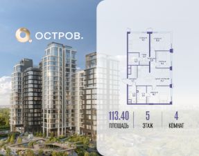 Продаётся четырехкомнатная квартира от застройщика: общая площадь 113.40 м², жилая 57.20 м², кухня 23.70 м², 5, жилой квартал "Остров 12", корпус 3 (12.1 квартал) (секция 1). срок сдачи: 4-кв. 2025.