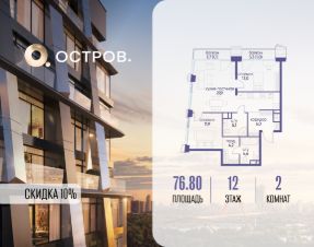 Продаётся двухкомнатная квартира от застройщика: общая площадь 76.80 м², жилая 24.90 м², кухня 29.90 м², 12, жилой квартал "Остров 12", корпус 3 (12.1 квартал) (секция 1). срок сдачи: 4-кв. 2025.