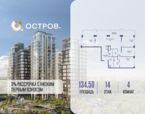 Продаётся четырехкомнатная квартира от застройщика: общая площадь 134.50 м², жилая 61.70 м², кухня 32.10 м², 14, жилой квартал "Остров 12", корпус 3 (12.1 квартал) (секция 1). срок сдачи: 4-кв. 2025.
