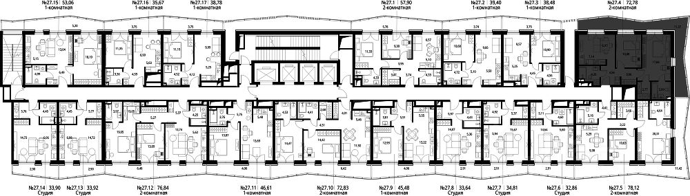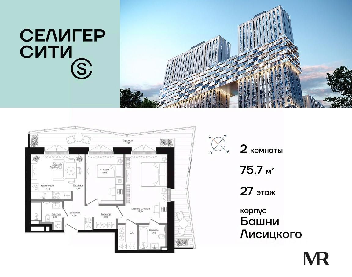 Продаётся 2-комнатная квартира общей площадью 75.76 м² без отделки в ЖК "Селигер Сити" на 27-м этаже башни Лисицкого.